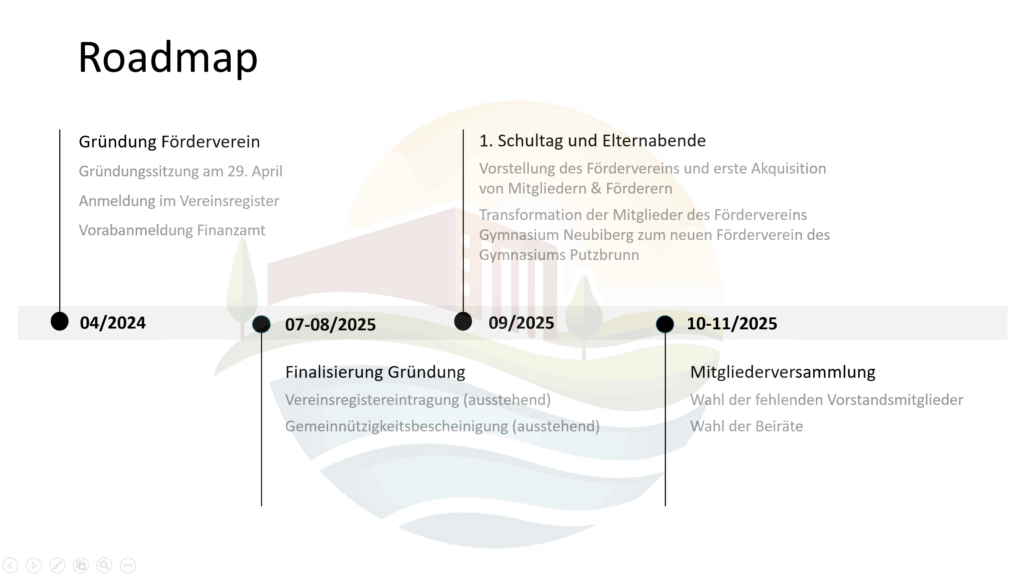Daten und Fakten Der Förderverein wurde im April 2025 gegründet und hatte im November 2025 bereits über 70 Mitglieder. Roadmap-Gruendung-Foerderverein-Gymnasium-Putzbrunn